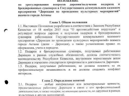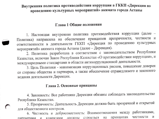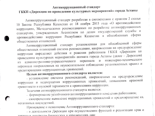 ГККП «Дирекция по проведению культурных мероприятий» акимата города Астаны (далее - Предприятие) соблюдает антикоррупционное законодательство в частности Закон Республики Казахстан от 18.11.2015 года №410-У «О противодействии коррупции». С целью реализации поставленной законодательством требований на сайте Предприятия размещены следующие ВНД: